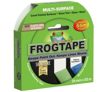 FrogTape Multi-Surface is a medium adhesion painter's tape for use on painted walls, wood trim, glass and metal.