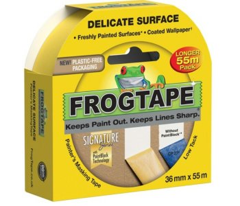 FrogTape Delicate Surface is a low tack painter's masking tape for use on freshly painted surfaces, most coated wallpaper and newly plastered walls.
