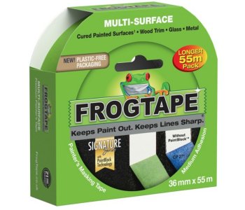 FrogTape Multi-Surface is a medium adhesion painter's tape for use on painted walls, wood trim, glass and metal.