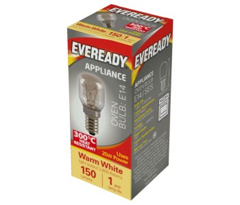 Eveready 25W oven bulb Voltage: 220v - 240v Endcap: SES E14 Heat resistant up to 300 degrees Light output: 150 lumens Bulb life: 1000 hours approx Boxed Product Code: 570765